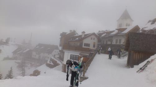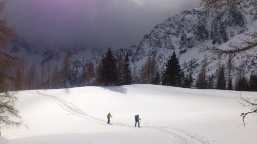 Sonntag gehts sehr früh los. Na ja, die geplante Abfahrt um 7 wird auf 7.30 verschoben und wir trinken noch gemütlich einen Cafe zusammen. Um 8.30 stehn wir dann aber schon auf den Ski am Fusse des Mt. Lussari. Diese Tour ist immer eine Herausforderung für mich. 1000Hm den steilen Pilgerweg hinauf. Sehr anstrengend für mich (vor allem weil ich die Skitour vom Tag davor auf die Ogrisalm in den Beinen spüre). Aber mit jedem Schritt gehts mir besser und ich geniesse die Tour und den leichten Schneefall. Durch das Gehen & die Natur spüre ich meine innerliche Ruhe und die Arbeitswoche und viele andere Sachen sind vergessen.Nach 2.5h haben wir es geschafft und beim Jure gibts ein gutes italienisches Essen. Somit habe ich den Gipfel von letzter Woche nachgeholt.