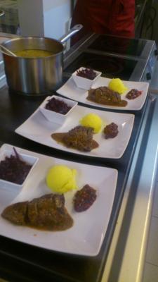 Danach gibt’s natürlich, mittlerweile schon Tradition, ein gutes Essen beim Schallerwirt. Wir zwei werden als Küchenhilfe eingespannt – es gibt Kartoffel-Schwammerlsuppe mit Polenta (an türkischen Sterz und a Schwammsuppen drauf) und dann Hirschsteak mit Polenta, Rotkraut & Preiselbeeren. Mich wunderts nicht, dass JO sich beim slow food guide eine Schnecke erkocht hat bei diesem guten Essen mit regionalen Zutaten...